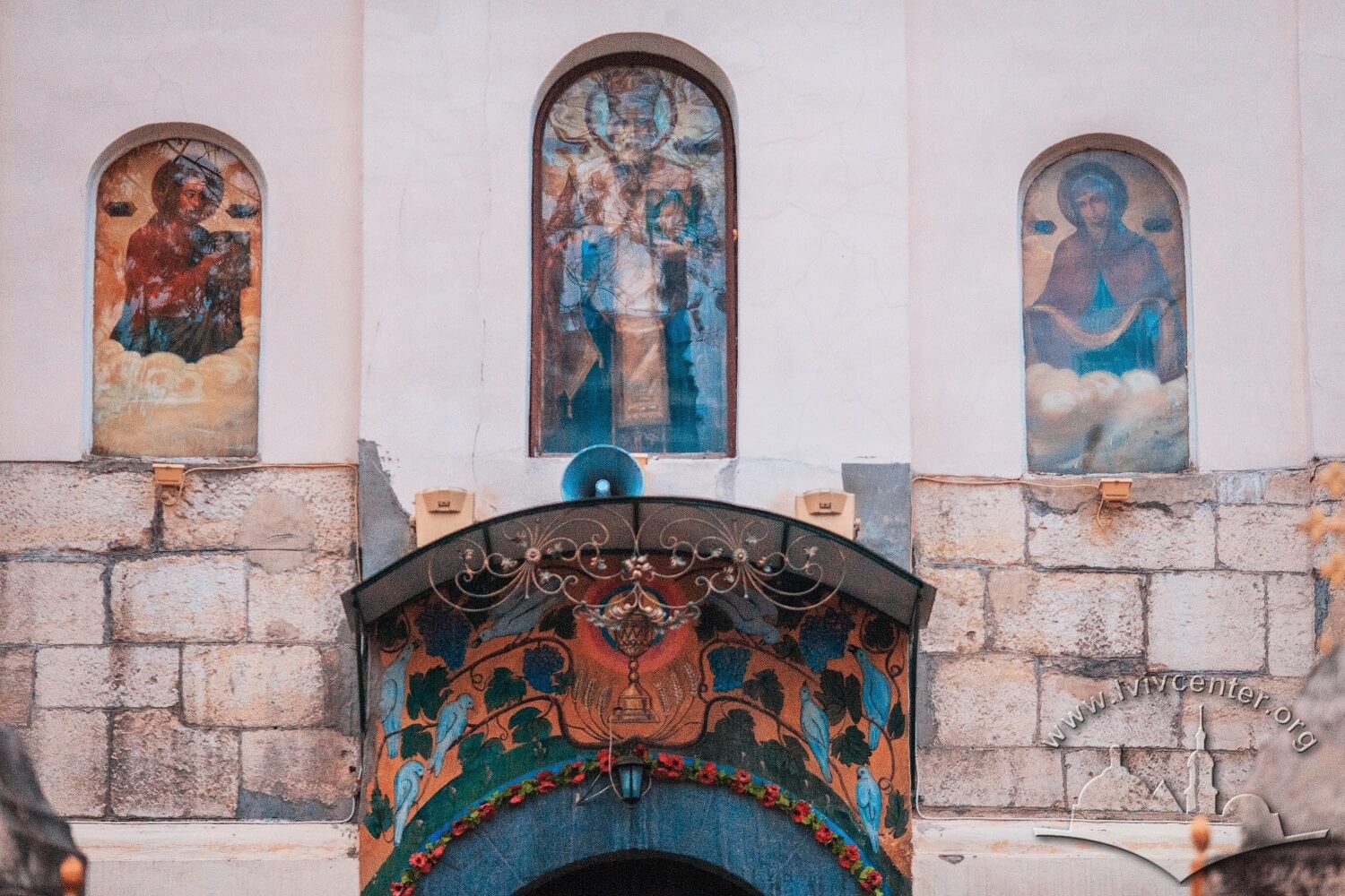 Vul. Khmelnytskoho, 36. The royal doors of the iconostasis with icons of Christ and Mary on their sides, and predellas below done by artist Modest Sosenko