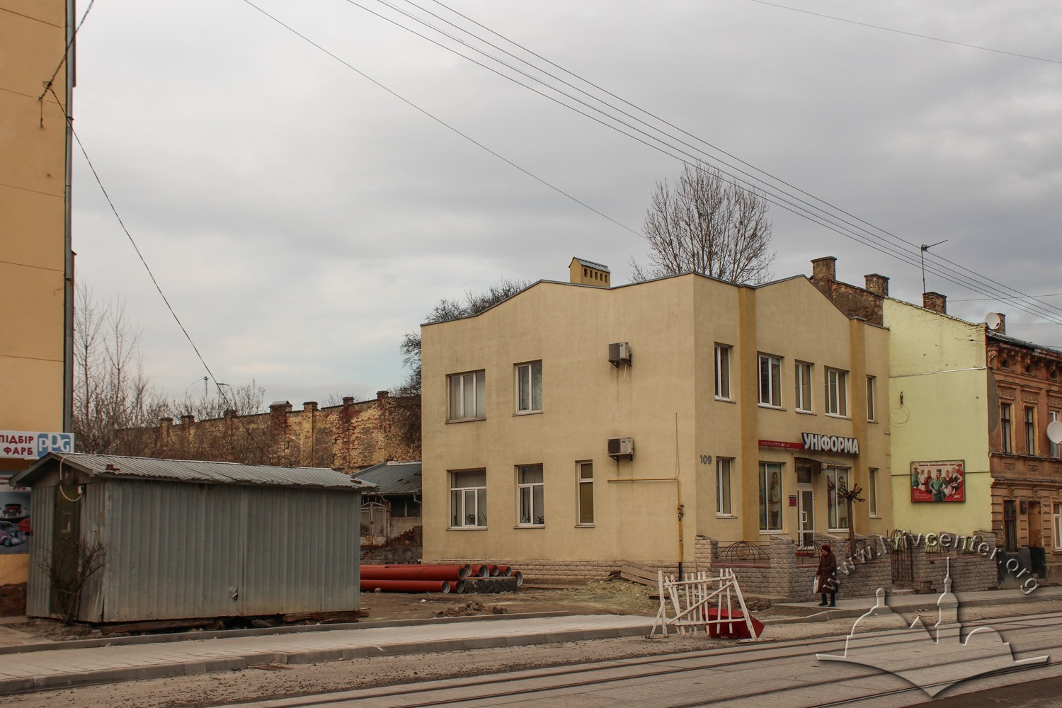 Vul. Promyslova, 29. Behind the fence on the right – the tram depot building which does not function today