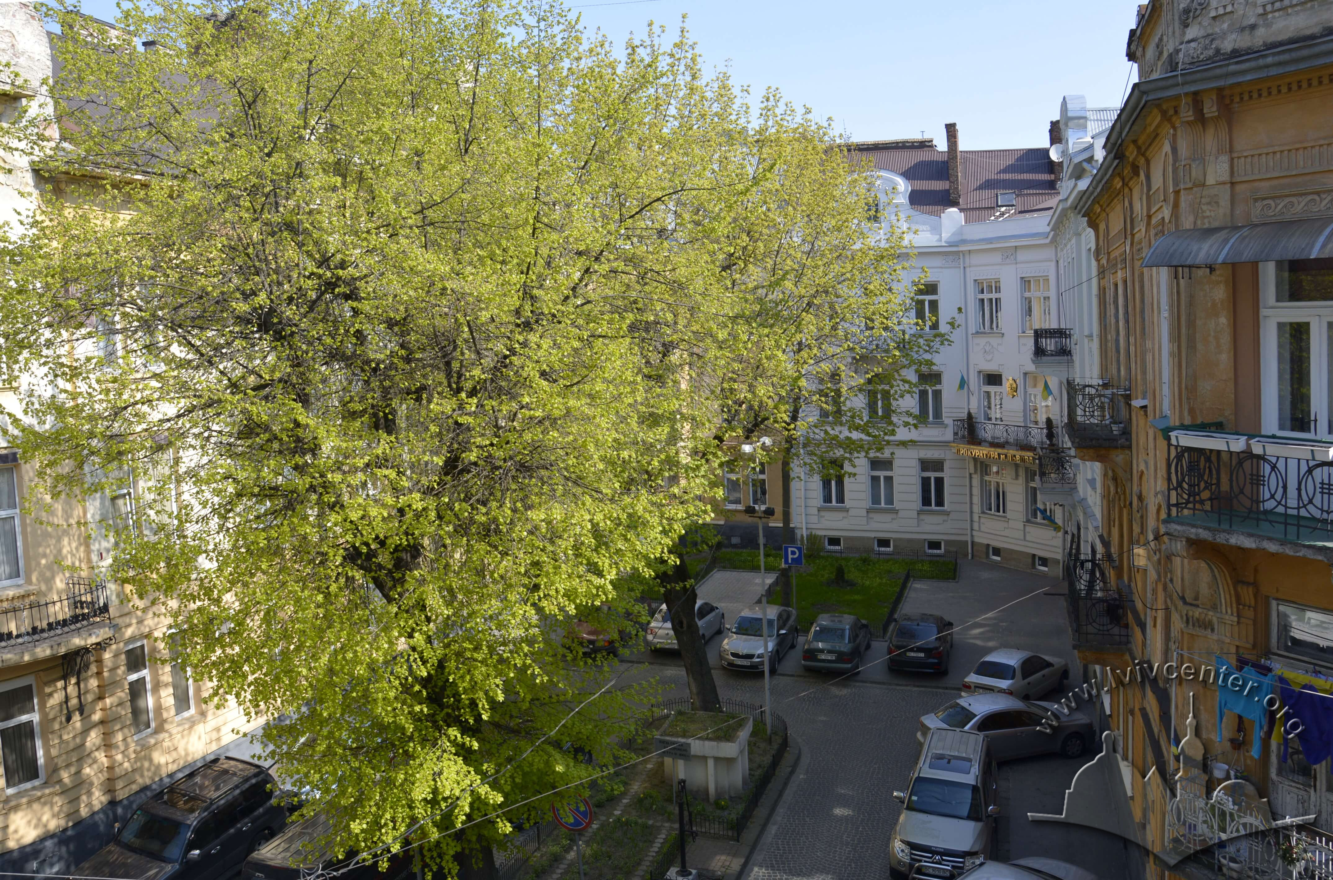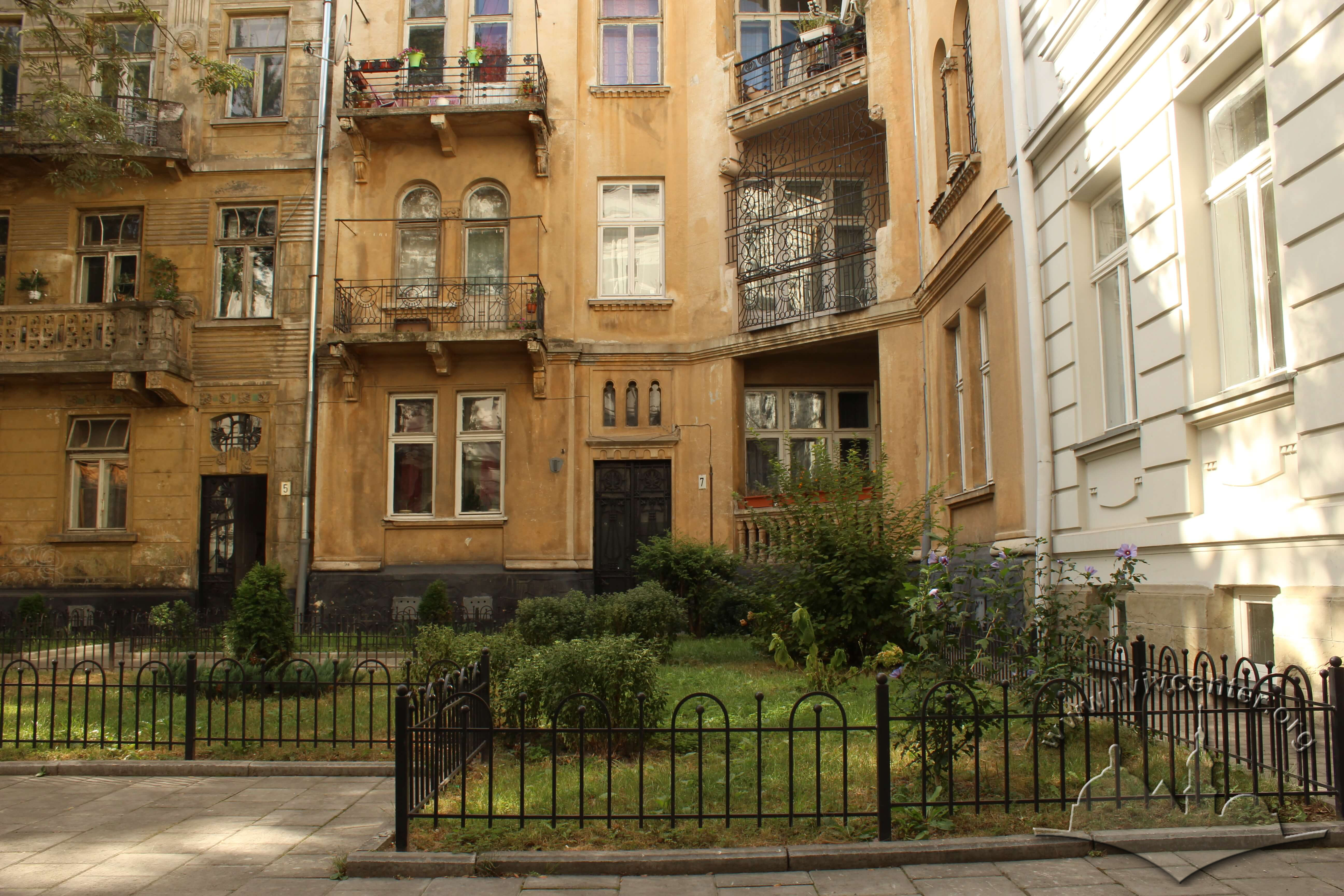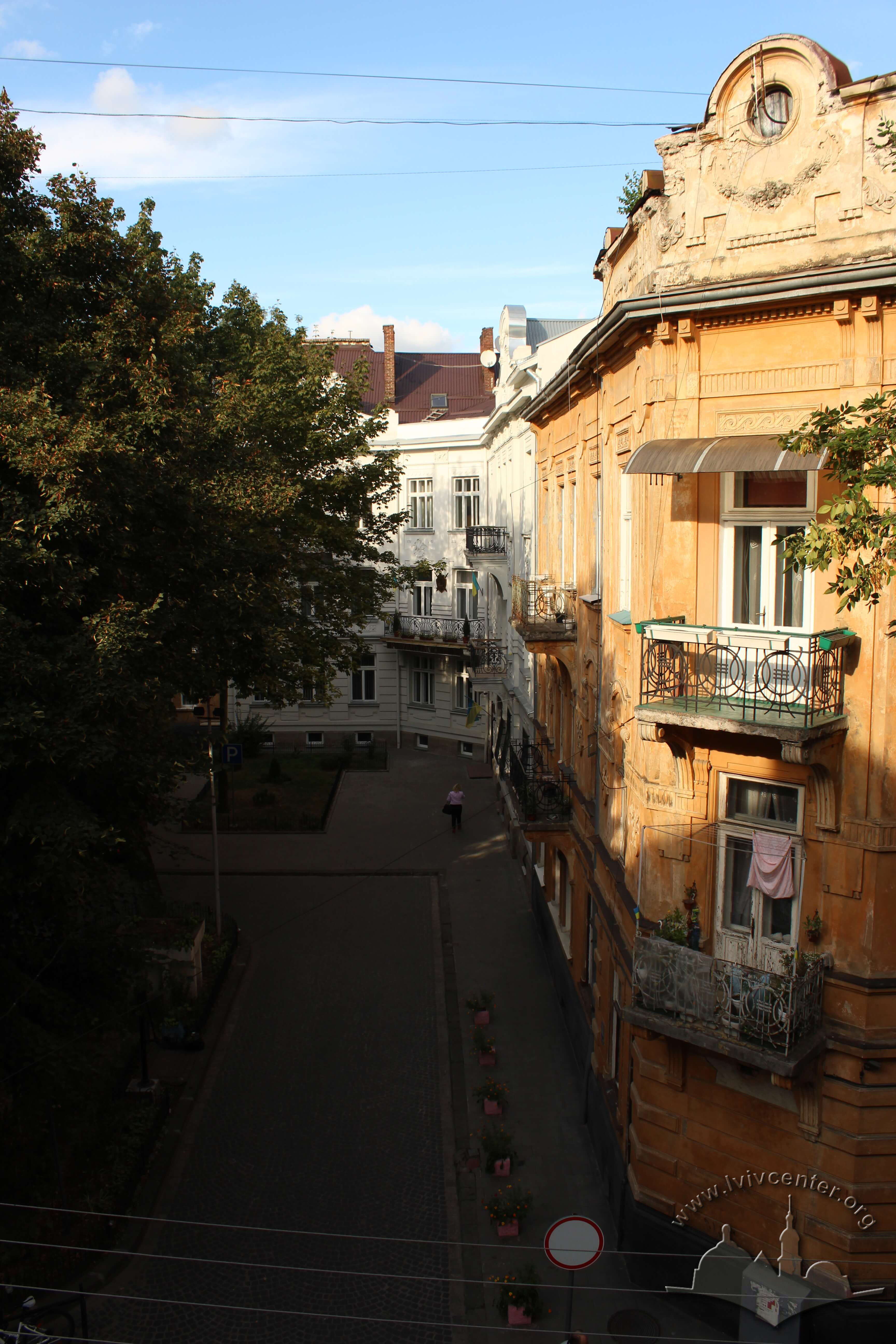 The green square was conceived by Ivan Levynskyi (Jan Lewiński) as a way to make the street more green and comfortable. At first it was essentially an island of green with a detour around. Some small trees and bushes were planted on it.When this green space was arranged, it appeared to be quite unusual for the city. Unlike usual courtyards of buildings used exclusively by residents of a particular building or of two adjacent ones and also unlike public parks and gardens designed for all townspeople in general, this space became something like a mean. On the one hand, it was public because of its location in the open space of the street. On the other hand, due to the very intimate nature of this street, it was used first of all by its inhabitants who lived in its thirteen houses. According to the residents of the street, the square was their common territory where they planted and cared for flower beds and could sit in the shade of trees; there was also a play ground for children there. However, with the increase in the number of vehicles these functions of the square are not actual any more. Its area is now smaller than it used to be, the detour around it serves for parking. Although the seclusion and the quiet nature of the street are not the same as before, yet compared to the surrounding streets, Bohomoltsia street can be seen in a quite favourable light.