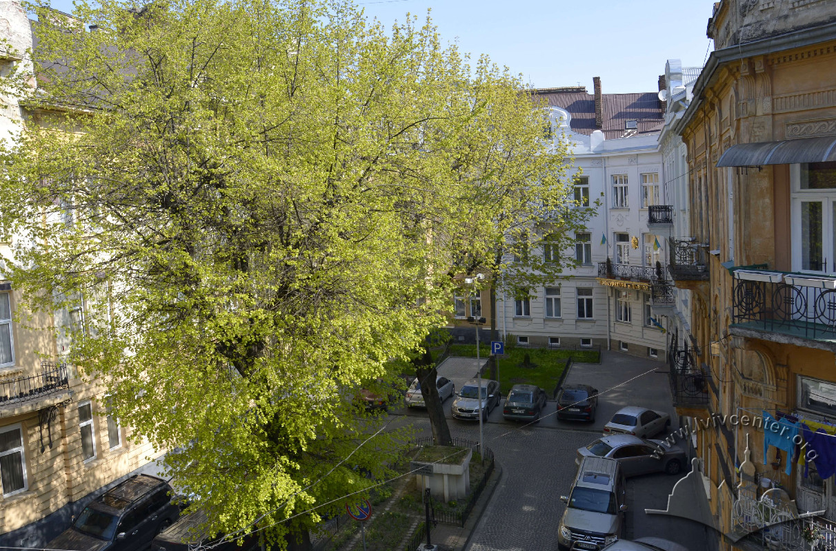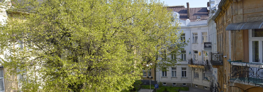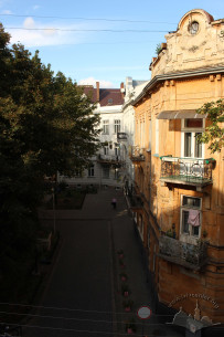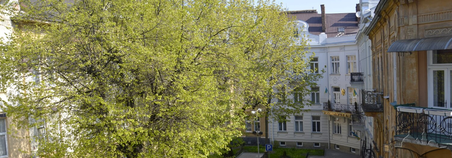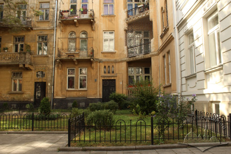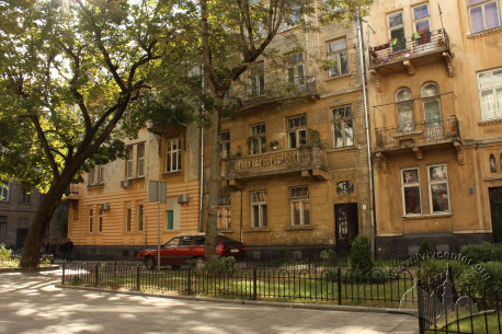 The green square was conceived by Ivan Levynskyi (Jan Lewiński) as a way to make the street more green and comfortable. At first it was essentially an island of green with a detour around. Some small trees and bushes were planted on it.When this green space was arranged, it appeared to be quite unusual for the city. Unlike usual courtyards of buildings used exclusively by residents of a particular building or of two adjacent ones and also unlike public parks and gardens designed for all townspeople in general, this space became something like a mean. On the one hand, it was public because of its location in the open space of the street. On the other hand, due to the very intimate nature of this street, it was used first of all by its inhabitants who lived in its thirteen houses. According to the residents of the street, the square was their common territory where they planted and cared for flower beds and could sit in the shade of trees; there was also a play ground for children there. However, with the increase in the number of vehicles these functions of the square are not actual any more. Its area is now smaller than it used to be, the detour around it serves for parking. Although the seclusion and the quiet nature of the street are not the same as before, yet compared to the surrounding streets, Bohomoltsia street can be seen in a quite favourable light.