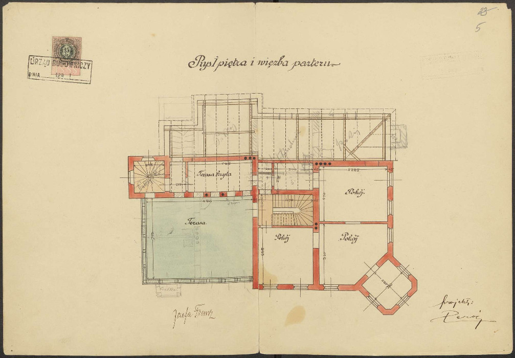 Згідно з бажанням Юзефи проєктантом вілли мав бути архітектор Ян Кудельський (Jan Kudelski), який тоді працював в бюро Івана Левинського. Дозвіл був даний 26 квітня того ж року (ДАЛО 2/1/3400: 2–4). Однак проєктні креслення, затверджені 30 квітня, підписав архітектор Ян Перось (Jan Peroś). На кресленнях бачимо частково одно-, частково двоповерхову віллу у французькому стилі, на високому цоколі, з терасою та наріжником, увінчаним куполом (ДАЛО 2/1/3400: 10–13). Будівництво, однак, затягнулось.