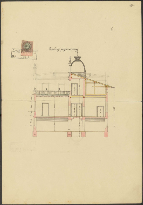 Поперечний розріз дає певне уявлення про зовнішній вигляд будівлі. Зокрема бачимо необароковий витягнений купол двоповерхового наріжника, увінчаний кованою короною та шпилем.