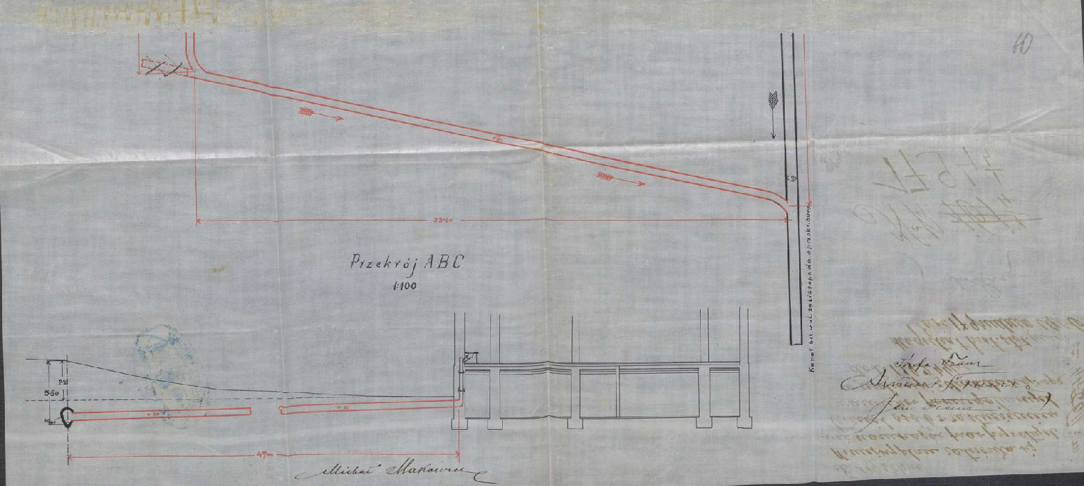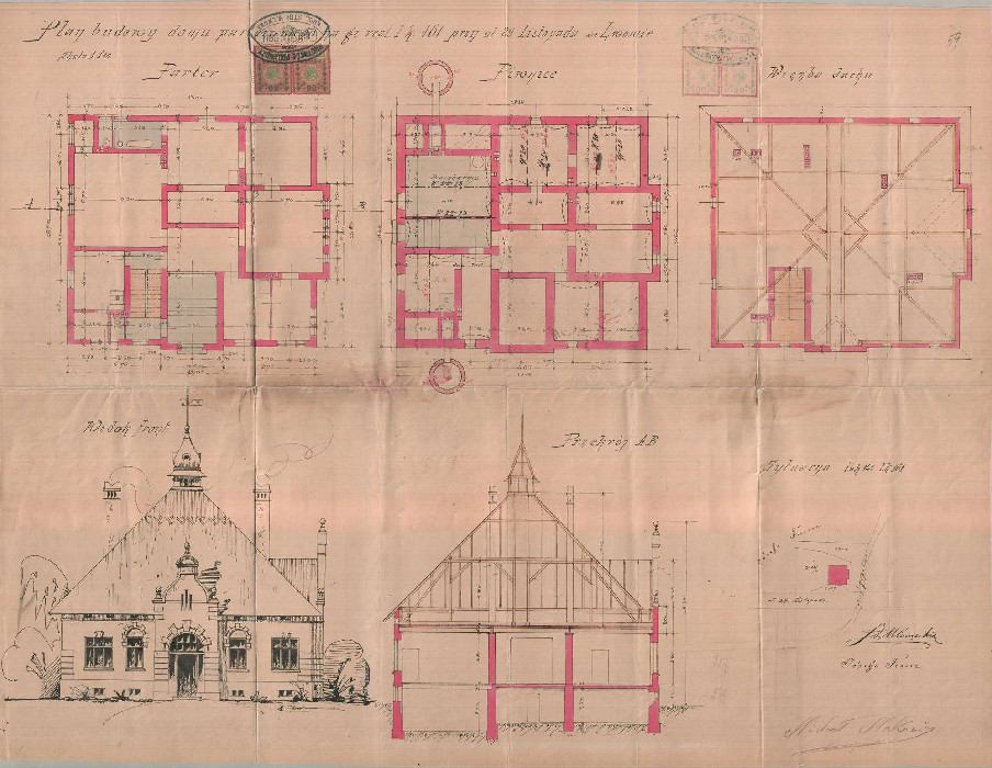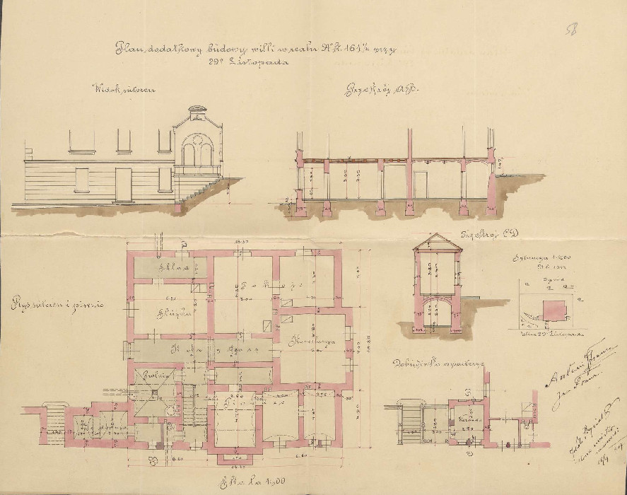 На додатковому кресленні з 1907 року, яке підписав Якуб Рисяк, в цокольному поверсі розташовані кімнати для прислуги та житлові, канцелярія, підвали для зберігання продуктів, також показана пральня, щоправда вона перемістилася ближче до головного фасаду.